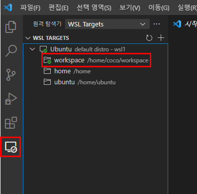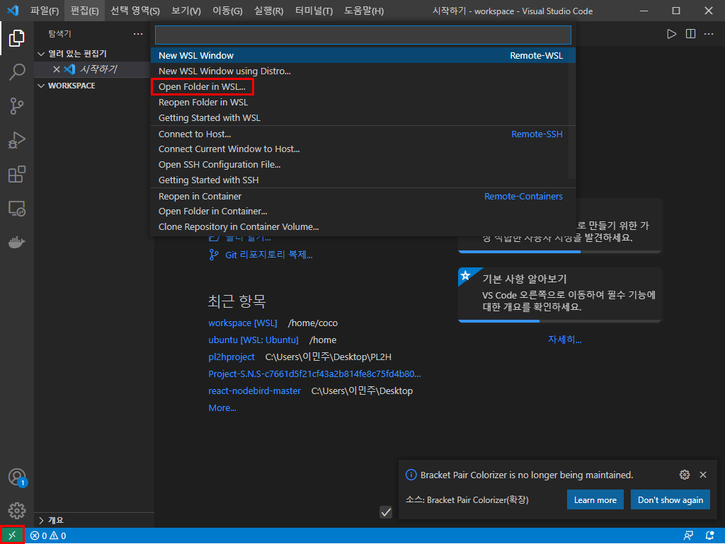 - vscode 실행 후 왼쪽 아래 >< 버튼을 클릭