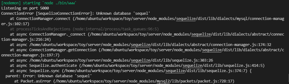 - 위의 상태로 app.js 를 실행 시키면 아래 에러가 등장, DB가 만들어지지 않아서 발생하는 에러