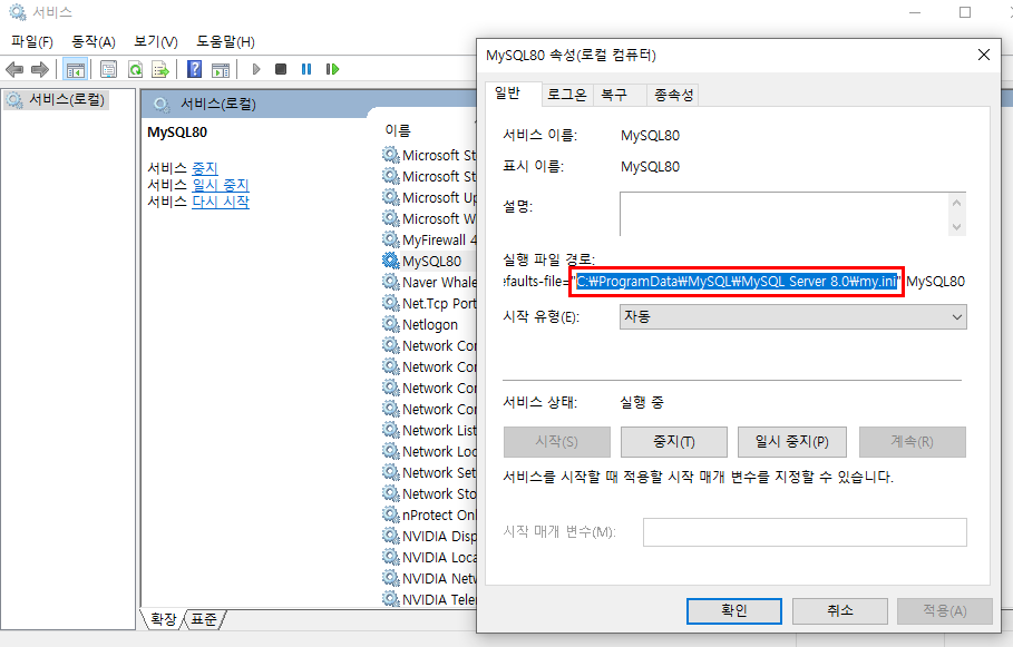 : 서비스 - 이름에서 MySQL찾아서 우클릭 - 속성 - 실행파일경로 - defaults-file 경로 확인