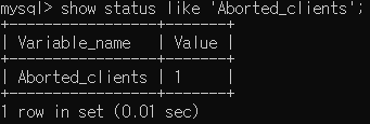 - Aborted_clients : 클라이언트가 정상적으로 연결되었지만 이후 부적절하게 혹은 강제적으로 종료되었을때의 상태값