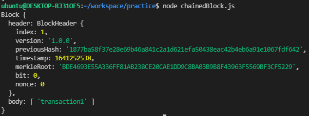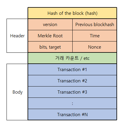 - bit와 nonce에 대해서는 추후 작업증명방식의 합의알고리즘 구성시 변경될 예정.