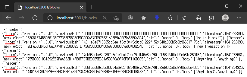 마찬가지로 /blocks 에서 추가된 블럭들이 확인 됨