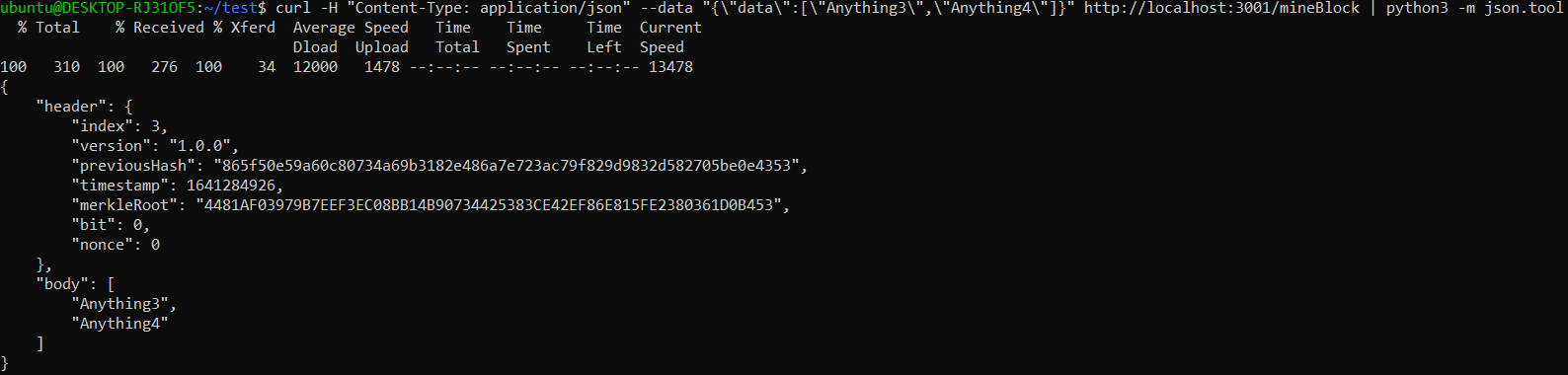 curl -H "Content-Type: application/json" --data "{\"data\" : [\"Anything1\",\"Anything2\"]}" http://localhost:3001/mineBlock