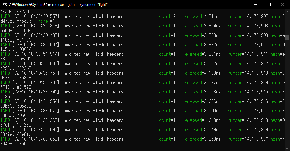 - geth가 블록체인 전체를 동기화하면 콘솔창에 뜨는 내용들이 느려지고 실시간으로 새 블록이 블록체인에 추가되는 것을 보여줌.