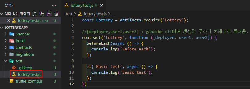 - 주의사항 : migrations 의 2_deploy_smart_contract.js는 테스트 할 때는 사용되지 않음.