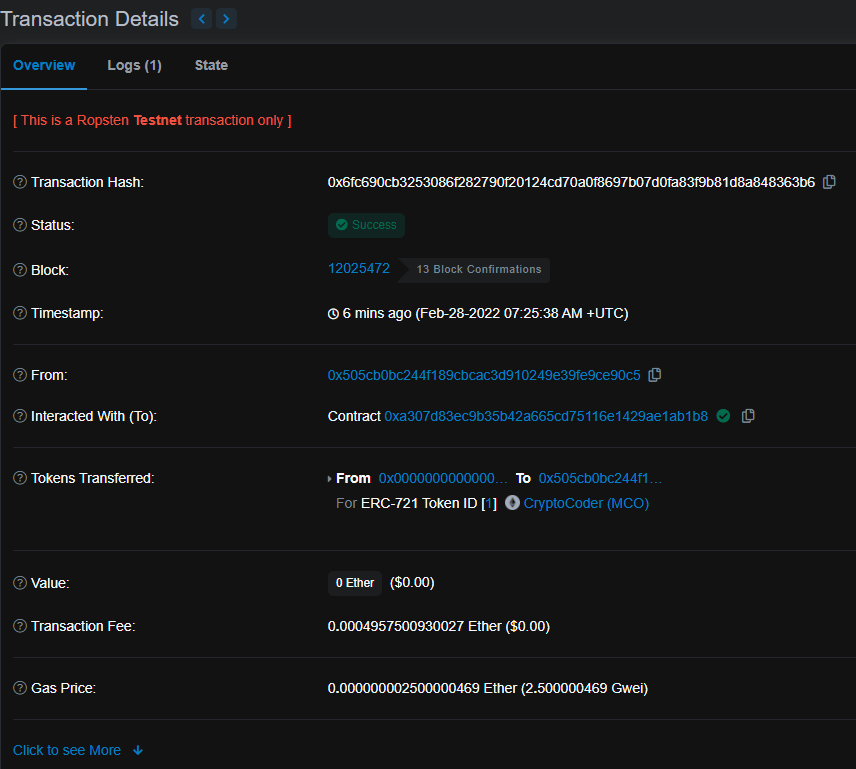 8. https://ropsten.etherscan.io/ 에서 컨트랙트 조회