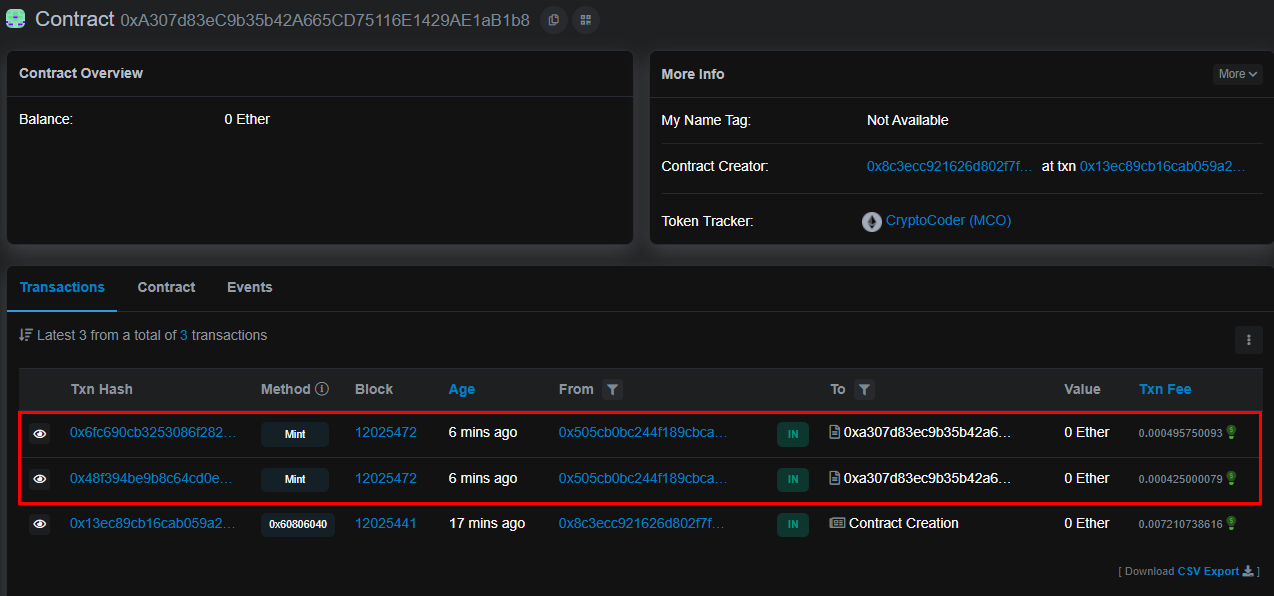 또한, 다시한번 컨트랙트 주소를 조회해보면 발생 시킨 2건이 추가되었음을 확인 할 수 있음