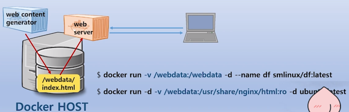 - 호스트의 webdata는 aphache 웹서버의 /var/www/html로 볼륨마운트, 단 호스트의 데이터를 수정하지 못함, 읽기만 한다.