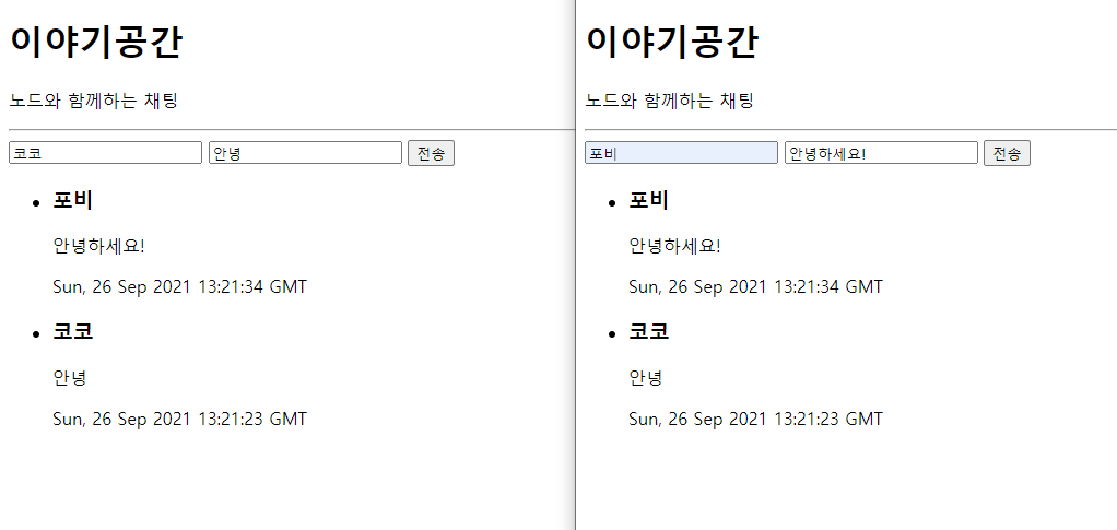 4. 결과물 : 창을 2개 열어서 확인해 보니 아래와 같이 출력됨!