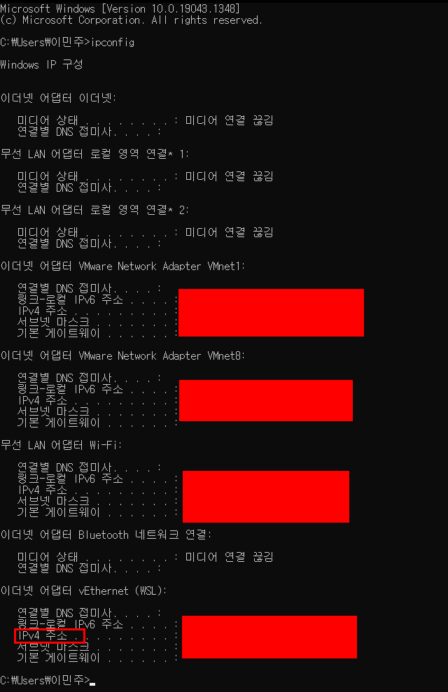 9. CMD(윈도우+R 에서 CMD 검색)창을 열어서 ipconfig 로 내 정보 확인