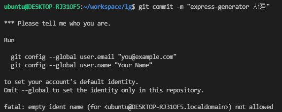 - 이메일과 사용자이름이 설정이 안되어 있어서 커밋이 되지 않았다.