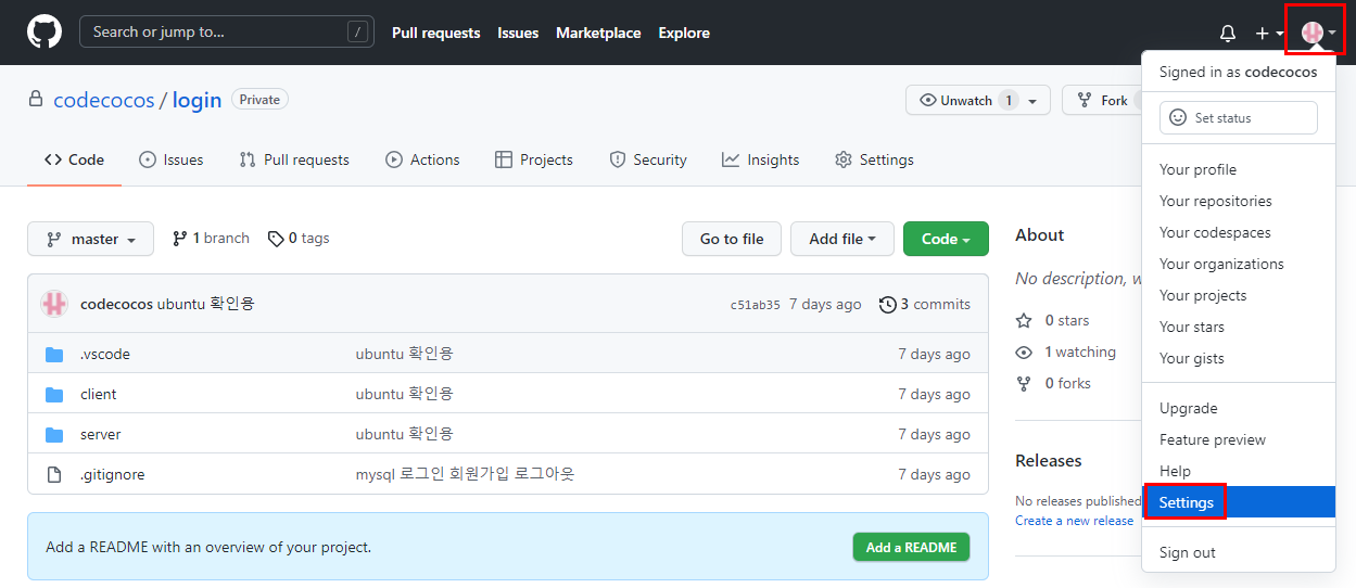 1. github 로그인 후 오른쪽 위 계정 클릭 -> Setting 클릭