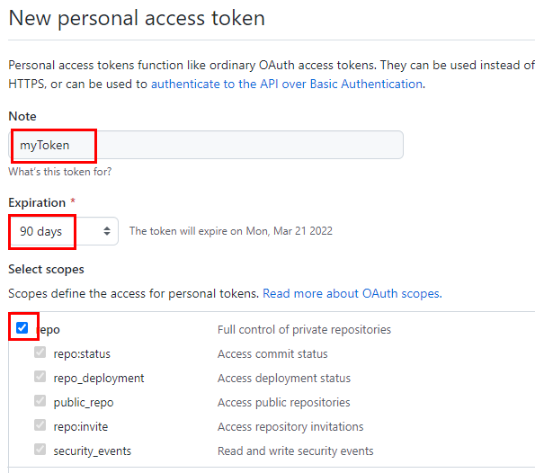4. 토큰이름과 기한 작성 후 허용할 범위 선택 (별다른 특이사항이 없다면, repo만 선택해도 무방)