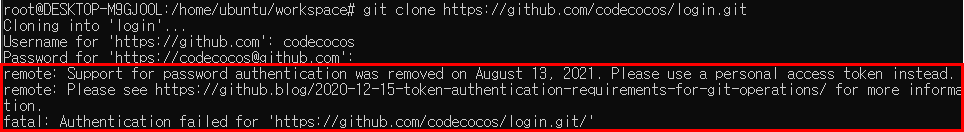 fatal: Authentication failed for 'https://github.com/codecocos/login.git/'
