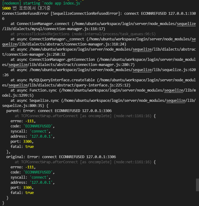 at async ConnectionManager._connect (/home/ubuntu/workspace/login/server/node_modules/sequelize/lib/dialects/abstract/connection-manager.js:318:24)