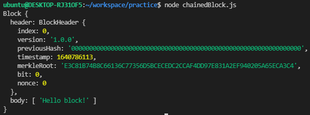4.2.1.1 createGenesisBlock() : 콘솔로그 결과 확인