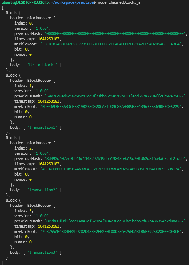 - bit와 nonce에 대해서는 추후 작업증명방식의 합의알고리즘 구성시 변경될 예정.