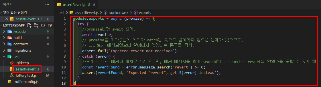 test/lottery.test.js 파일 상단에 assertRevert.js 불러오기