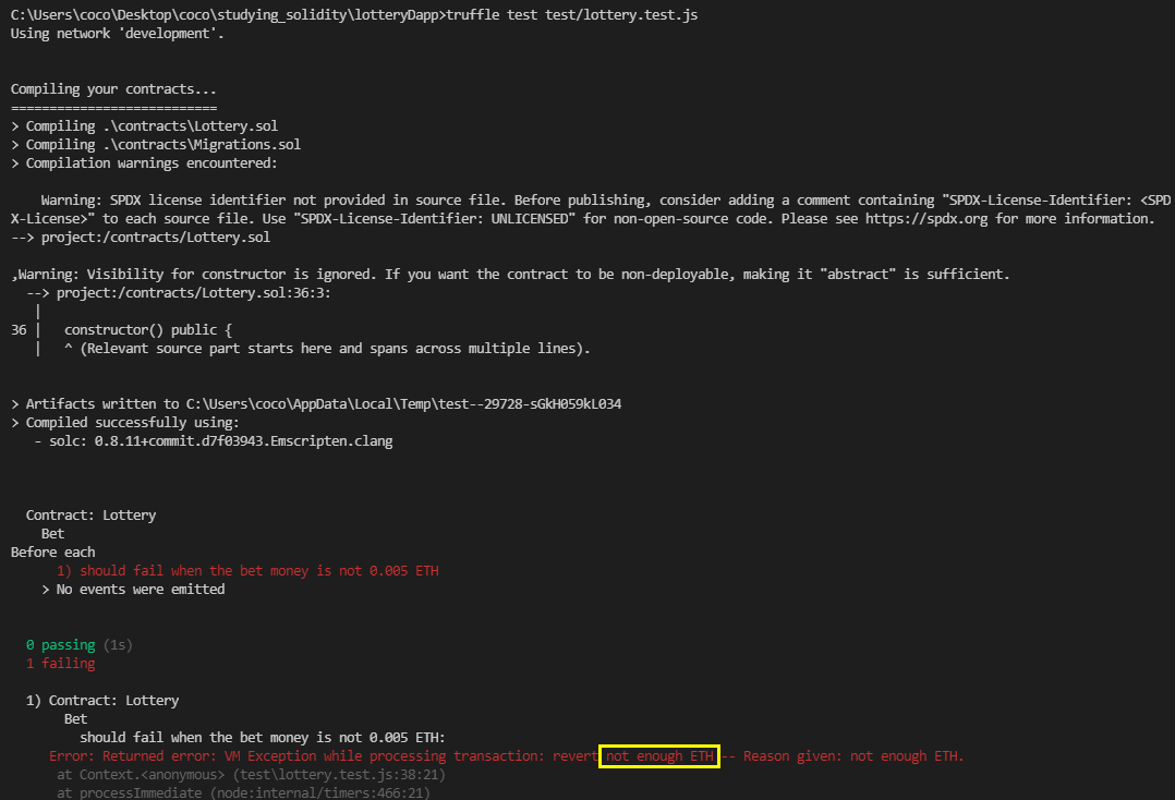 await assertRevert(lottery.bet('0xab', { from: user1, value: 4000000000000000 })) // queue의 0번