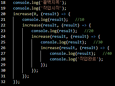- 비동기 처리 연산을 위해 콜백 함수를 연속으로 사용할 때 발생