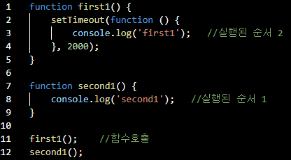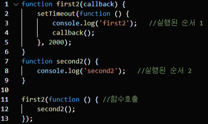 - 일반적으로 콜백함수는 다른 함수의 매개변수로 함수를 전달하여, 특정시점에 매개변수로 전달한 함수가 다시 호출되는 함수를 말함.